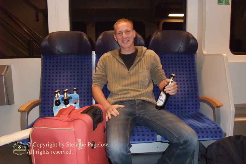 Abend starten wir ganz entspannt mit der Bahn Richtung Hamburg. Die erste Flüssignahrung ist bereits bis Hamburg aufgebraucht. Ab Hamburg haben wir dann einen Intercity gebucht. Über nacht reisen wir in einem entspannten Schlafwagen bis nach Düsseldorf. Wir haben ein 6er Abteil ganz für uns allein und können sie die Sitze zusammen ziehen, sodass es eine große Liegefläche ergibt. Zwischendurch wurden wir nur vom Fahrkartenkontrolleur geweckt. In Düsseldorf angekommen steigt meine Aufregung langsam aber stetig. Dies wird mein erster Flug. Ron hat Gott sei Dank schon einige Flüge hinter sich und lässt alles entspannt über sich ergehen. Ich habe meine analoge Kamera dabei und diese natürlich im Handgepäck verstaut, damit sie nicht zu viel durch die Gegend geworfen wird. Bei der Personenkontrolle muss Ron mal wieder seine Schuhe ausziehen. Ich war kurz vor ihm, meine Kamera hat aber auch für Probleme gesorgt, schließlich könnte man in den Leerräumen der Objektive flüssigen Sprengstoff oder andere Sachen mitführen. Nach der Kontrolle meines Handgepäcks musste ich einem Beamten „unauffällig“ durch den halben Flughafen folgen.