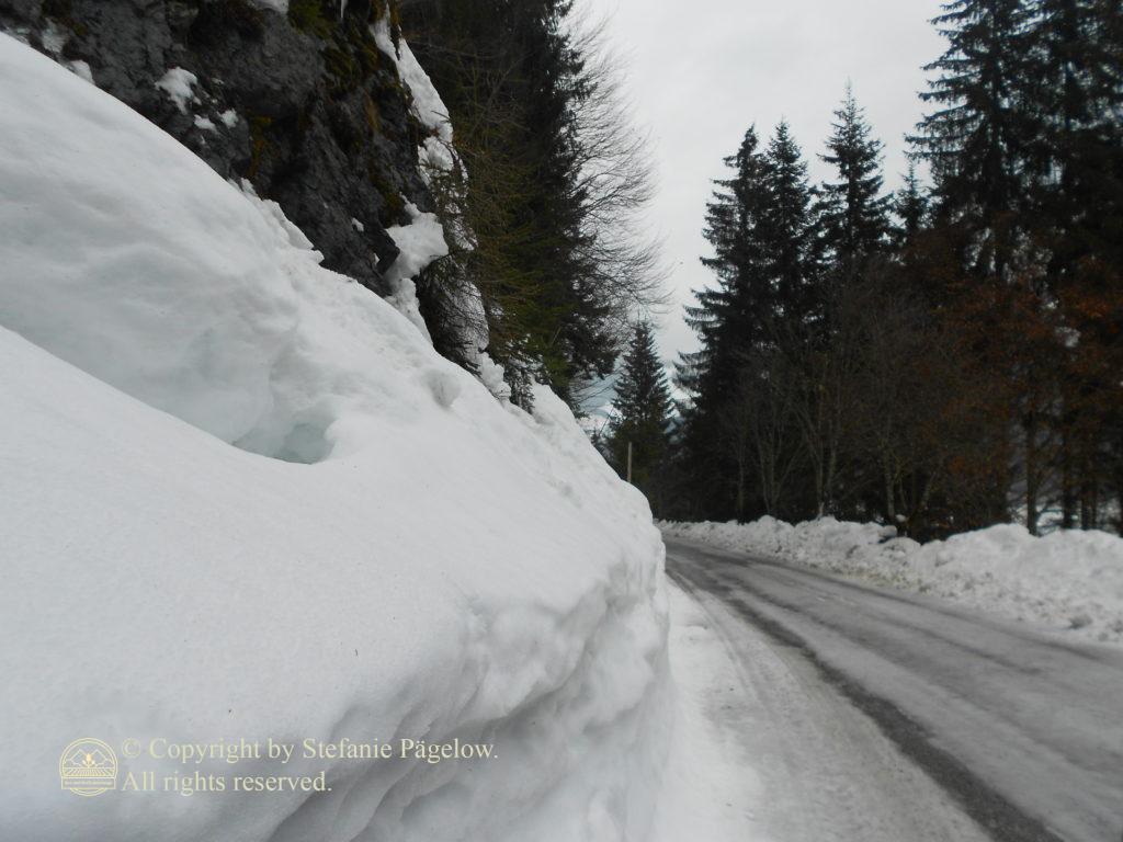 Der Weg zu unserer Ferienwohnung schlängelte sich langsam den Berg hoch. An einer etwas breiteren Stelle habe ich beschlossen sicherheitshalber erst einmal die Schneeketten anzulegen. An der Stelle wäre es vielleicht noch nicht notwendig gewesen, aber die Einheimischen kommen uns hier mit einem Tempo entgegen, dass ich mir nicht sicher war, ob es noch eine bessere Stelle geben würde. Und wie wir dann nach der Kurve festgestellt haben, war die Entscheidung auch gut. Die Straße wurde nur noch steiler und enger. Und geräumt wird hier einfach nicht.
