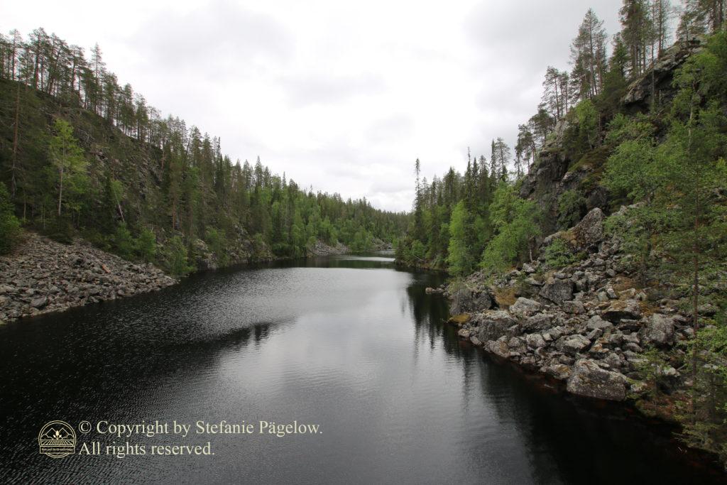 Nach einem gemütlichen Frühstück ging es heute erst einmal mit dem Auto ca. 17 km in den Nationalpark hinein. Angekommen am Parkplatz haben wir unsere 6 km Wanderung um den Julma-Ölkky begonnen. Es gibt noch eine weitere Strecke, die entlang der gesamten Schlucht führt, für uns reicht aber die Abkürzung über die Hängebrücke auf etwa der Hälfte der Strecke. Bereits nach den ersten 100m ging es steil bergauf und bergab. Der Weg war schön und gepflegt, aber es ging immer wieder über Stock und Stein. Da war ich über die zusätzliche Stütze (mein neuer Wanderstock) sehr dankbar. Die Landschaft und die Ausblicke sind wunderschön. Anfangs begegnen wir keiner Menschenseele. Wir haben den tollen Wanderweg ganz für uns allein. Nach ca. 2/3 informiert uns ein Schild über zwei Wandermöglichkeiten. Entweder den neu angelegten, etwas längeren Weg oder den alten, mit „poor Dougboards“. Wir haben uns für die zweite Möglichkeit entschieden. Die schmalen Holzpfade zwischendurch waren zwar etwas marode aber noch bewanderbar. An der Hängebrücke machen wir eine kurze Pause und schießen ein paar Fotos. Danach müssen wir dann erst einmal die Schlucht auf der anderen Seite erklimmen. Über Stein- und Eisentreppen erklimmen wir mit einigem Schnaufen den Abhang. Auf dieser Seite ist der Weg zum Großteil leichter zu bewältigen. Aber auch hier gibt es immer wieder Stellen, bei denen man auf jeden Tritt achten muss.